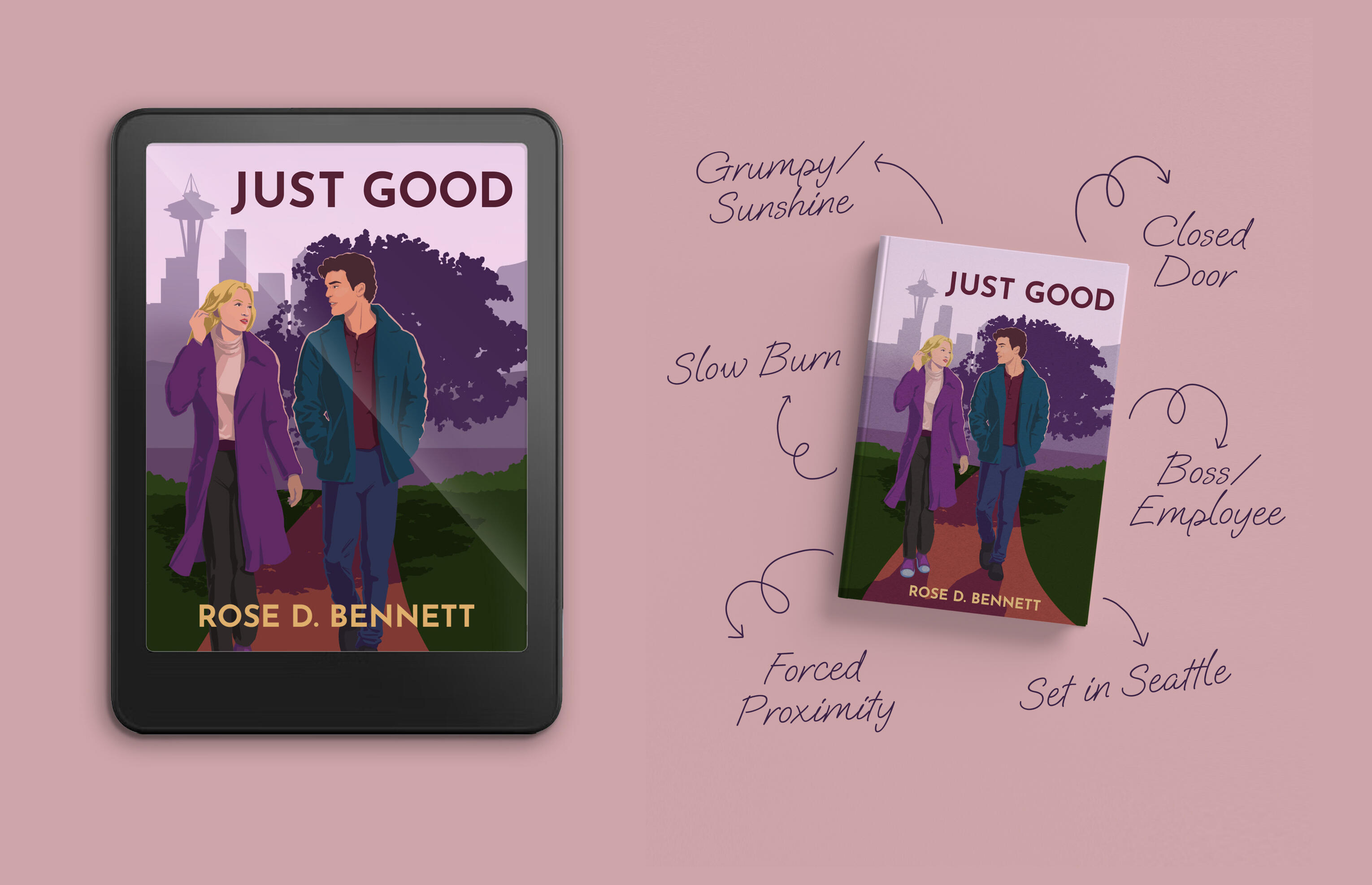 The cover for Rose D. Bennet's debut novel, Just Good, was so fun to design! The brief included: two characters not touching, Seattle location, and a purple-heavy colour scheme. I created some on-trend promotional materials for the book, as well.